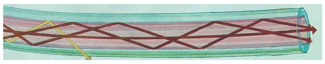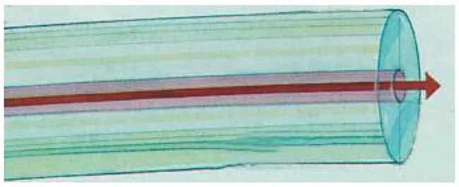 La reflexión interna total confina la luz en las fibras ópticas. Dado que el revestimiento tiene un índice de refracción menor, los rayos de luz se reflejan de vuelta hacia el núcleo si encuentran el revestimiento en un ángulo llano (líneas rojas). Un rayo que exceda un cierto ángulo “crítico” escapa de la fibra (línea amarilla).