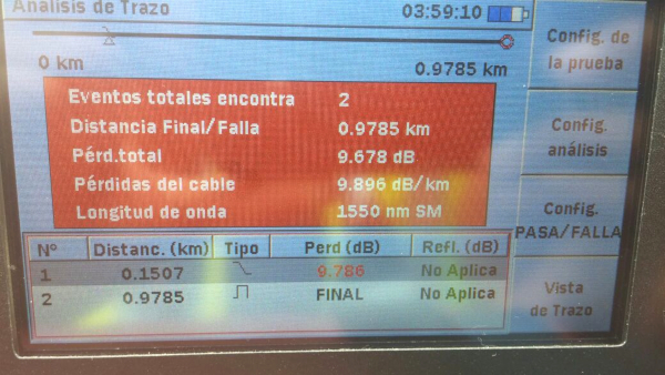 Después de realizar la medición como OTDR, podemos activar la función de Análisis de Trazo, que indica: Eventos Totales, Distancia Final, Pérdidas Total, Pérdidas del Cable y la Longitud de Onda. Pero adicionalmente, podemos configurar la Función PASA/FALLA, según algún Estándar o Normativa Internacional ( aunque también, es posible colocar valores limites personalizados con sistema de Alerta, para indicar cualquier posible inconveniente). Como podrán apreciar en la siguiente Lista de Valores, aparece con el fondo de color Rojo indicando que hay claramente una FALLA en el enlace.