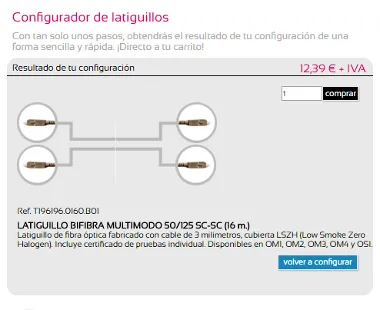 En el configurador se puede seleccionar entre latiguillos de fibra óptica o cobre. En 4 sencillos pasos, se logra configurar el latiguillo que necesite, seleccionando, el tipo de cable, la cubierta, la longitud, los conectores de cada extremo del latiguillo e incluso el tipo de pulido para cada terminal. Una vez configurado, se añade directamente en el típico carrito de la compra.