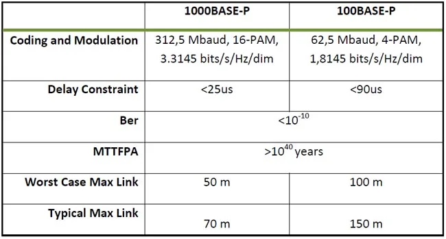 - 100BASE-P: enlace de 100 Mbps full-duplex y tasa binaria fija (opcional).