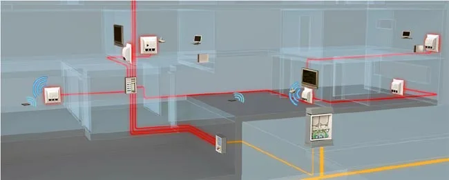 La figura siguiente muestra una instalación POF típica, que es la base de los resultados de rendimiento de Swisscom. El tiempo medio de montaje en redes domésticas es de dos horas (hasta media hora menos que Cat-5e). Así se logra una reducción del 25 por ciento.