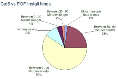 La figura, basada en los resultados de rendimiento de instalaciones Swisscom, compara los tiempos de instalación de Cat-5e y POF. Como se observa, en un 84 por ciento de los casos, POF ahorró hasta una hora en dicho proceso.