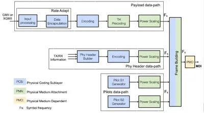 El diagrama de bloques de transmisión se muestra en la Figura 5 la arquitectura de HS-BASE-P. Las partes PCS/PMA y PMD están codificados en diferentes colores. Los tres paths de datos necesarios para construcción de trama, payload, cabeceras y pilotos aparecen en este diagrama.