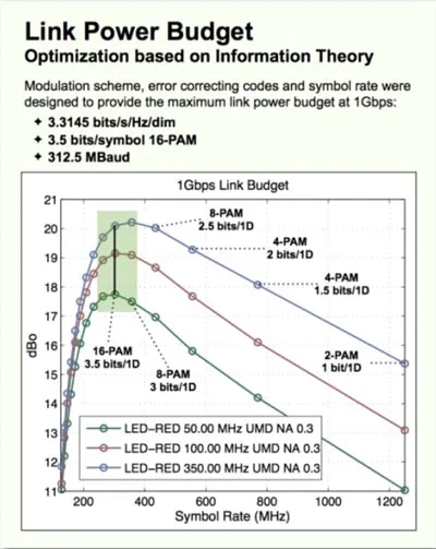 Un enfoque de optimización numérica basado en teoría de la información conlleva la selección de una “combinación ganadora” del ratio de símbolo de 312.5 MHz con niveles de modulación 16-PAM. Este “punto óptimo” se observa en la siguiente figura.