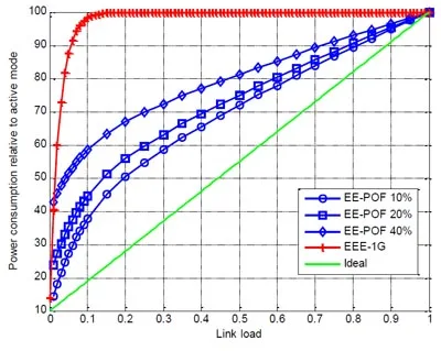 HS-BASE-P posibilita la implementación de EEE, que se traduce en un rendimiento óptimo en términos de consumo de potencia de todo el sistema de comunicación. La siguiente figura presenta las prestaciones EEE para diferentes tiempos de transición desde ON a IDLE. Para realizar una comparación, también se muestran las prestaciones de 1000 BASE-T EEE. HS-BASE-P EEE es claramente superior a la alternativa 1G BASE-T.