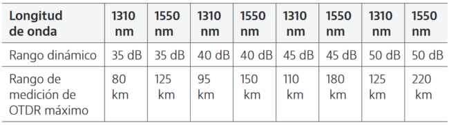 Rango dinámico: Determina la distancia a la cual las medidas del OTDR resultan eficaces. Depende de las pérdidas en los eventos y de la fibra real instalada, mira la siguiente tabla: