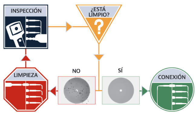- Inspección proactiva de conectores. Una sola conexión de fibra óptica sucia puede afectar al rendimiento total de la señal. Siga siempre el proceso de “limpiar antes de conectar”