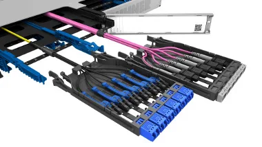 El sistema de gestión de fibra de HUBER+SUHNER ofrece una alta densidad de empaquetado sin por ello comprometer la manipulación de los cables.