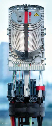 Los cables se extienden lateralmente en las entradas de cable. No existe necesidad de enrollar el cable en la base de la cubierta. Torpedo para proyectos FTTx Los kits de entrada de cable se pueden abrir, cerrar, cambiar y adaptar en pocos pasos: los conectores y los cables siempre se encuentran accesibles. Este enfoque pretende revolucionar el proceso de ensamblaje en campo y simplificar las tareas de mantenimiento durante la operación.